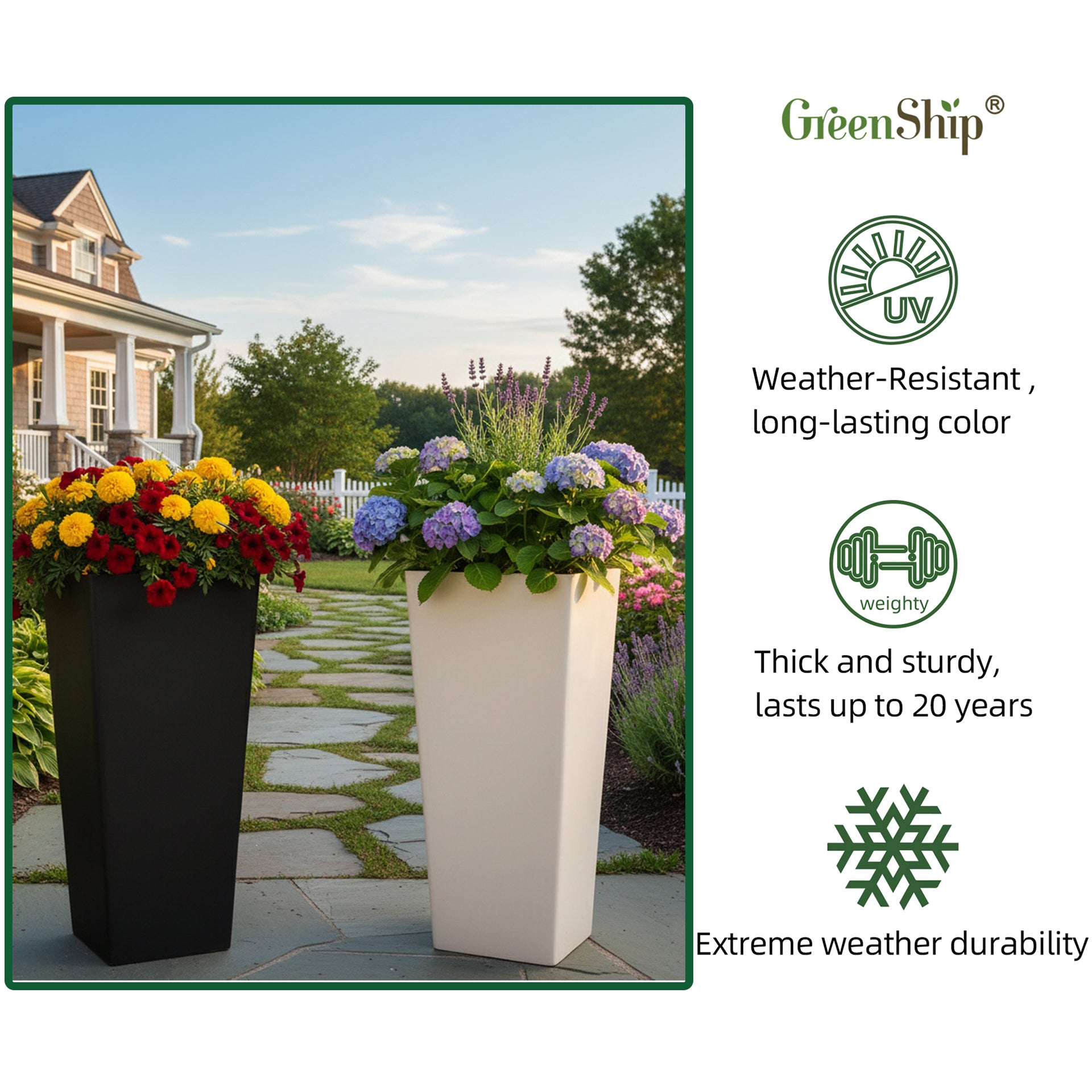 Weather-Resistant: Our patented material large planter ensures superior weather resistance for enduring durability indoors and outdoors.