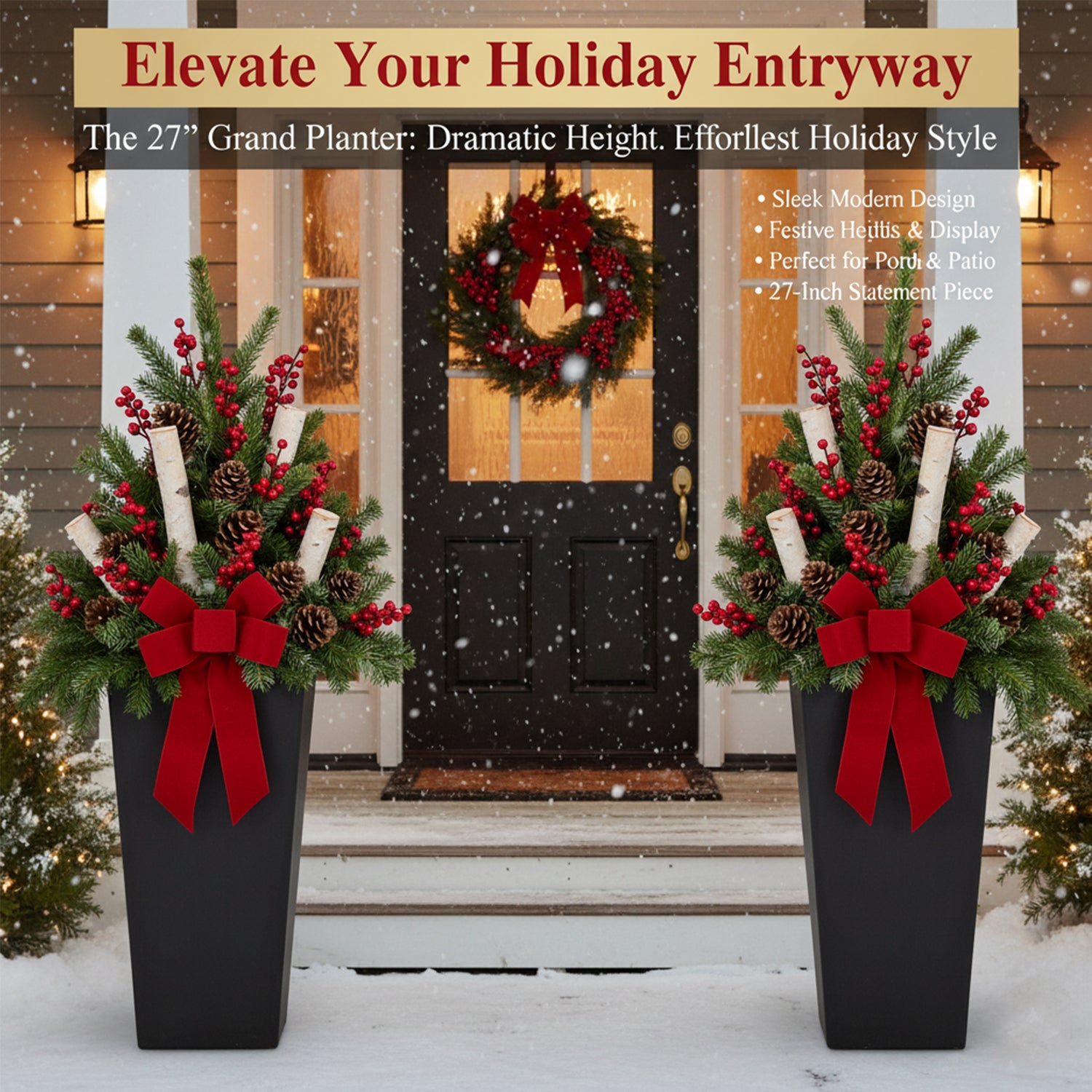 GreenShip 27 inch Tall Planters for Outdoor Plants, Large Flower Pots with Drainage & Inner Shelf, Modern Decorative Garden Pots for Porch, Patio, Front Door