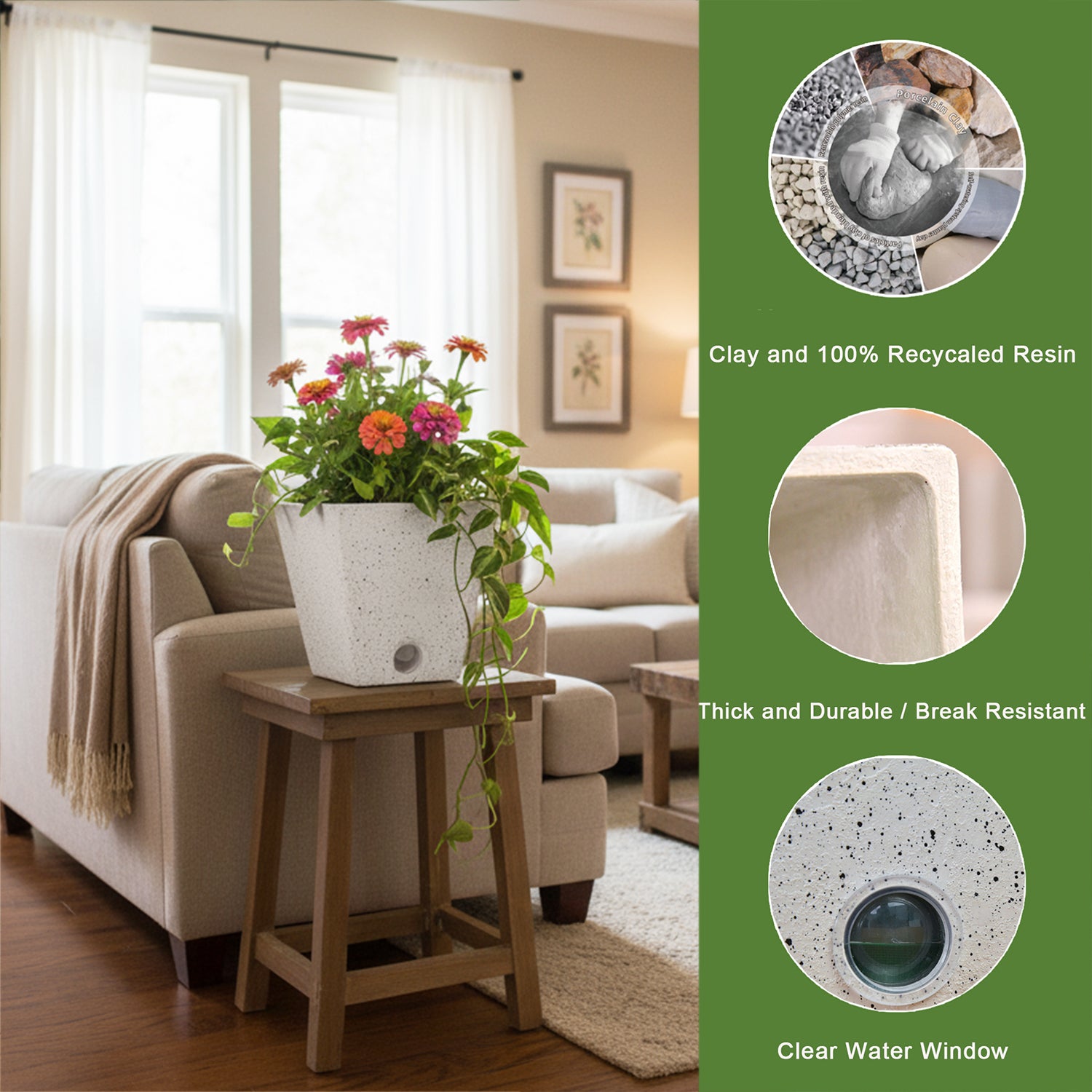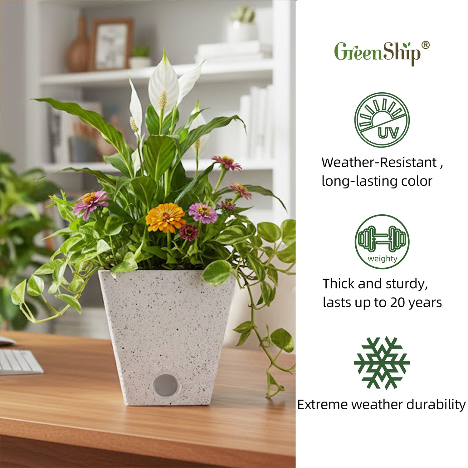 Handmade and unique designs: Our patented formula which mixed with 100% recycled resin and natural stone material resists normal againg, use at least 20 years! Handmade finish make our planter an unique appearance